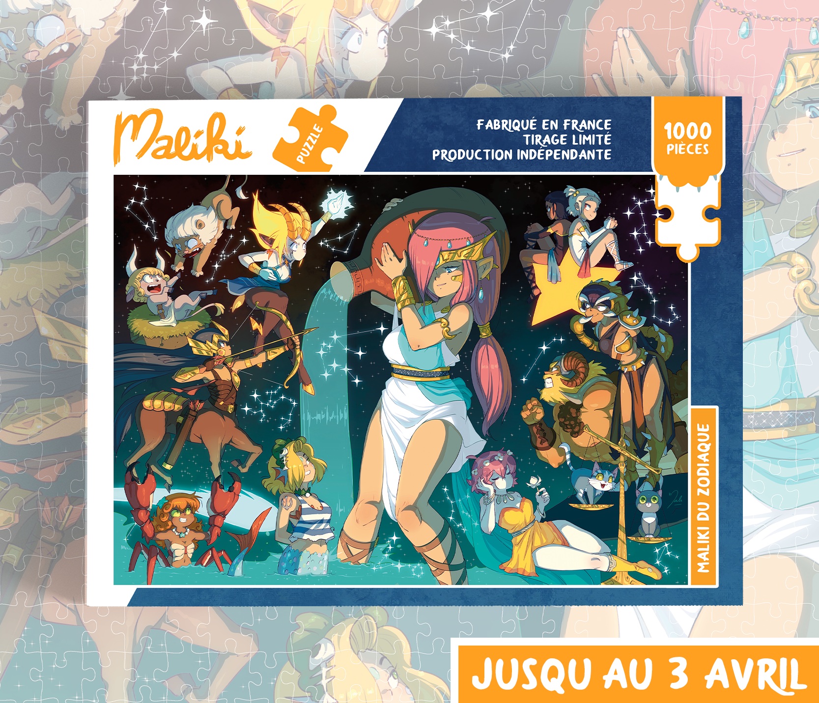Un GRAND puzzle 1000 pièces, d’une illustration inédite sur les signes du zodiaque. Dans sa belle boîte cartonnée, de fabrication française et toujours 100% indé et qualitatif. Pour tester sa patience et/ou partager un moment de complicité avec ses enfants. On espère ce que joli projet vous plaira, ça change un peu, non ? 😊